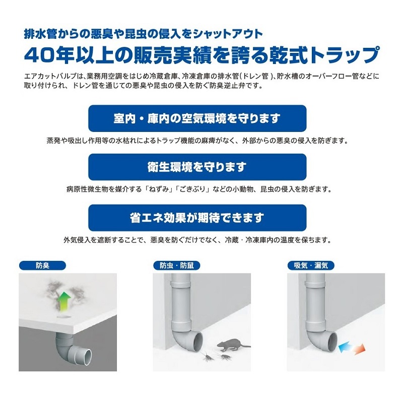 エアカットバルブは水封式トラップの欠点である蒸発や吸出し作用等水枯れによるトラップ機能麻痺が全くなく、極めて信頼性が高く、取り付けが簡単です。