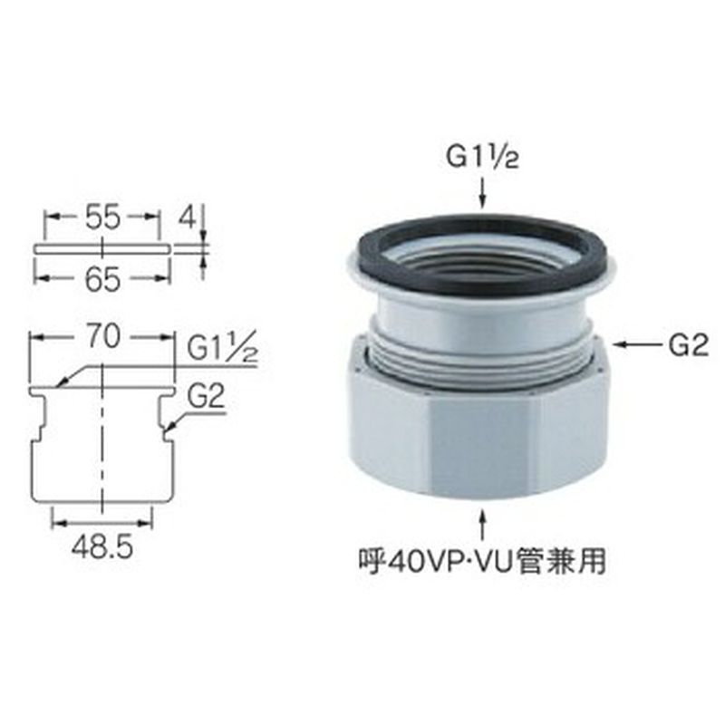 平パッキン面のG11/2ネジ型トラップをさしこみパッキン仕様のG2ネジに変換するアダプター。G11/2トラップに40A塩ビ管を接続できます。
