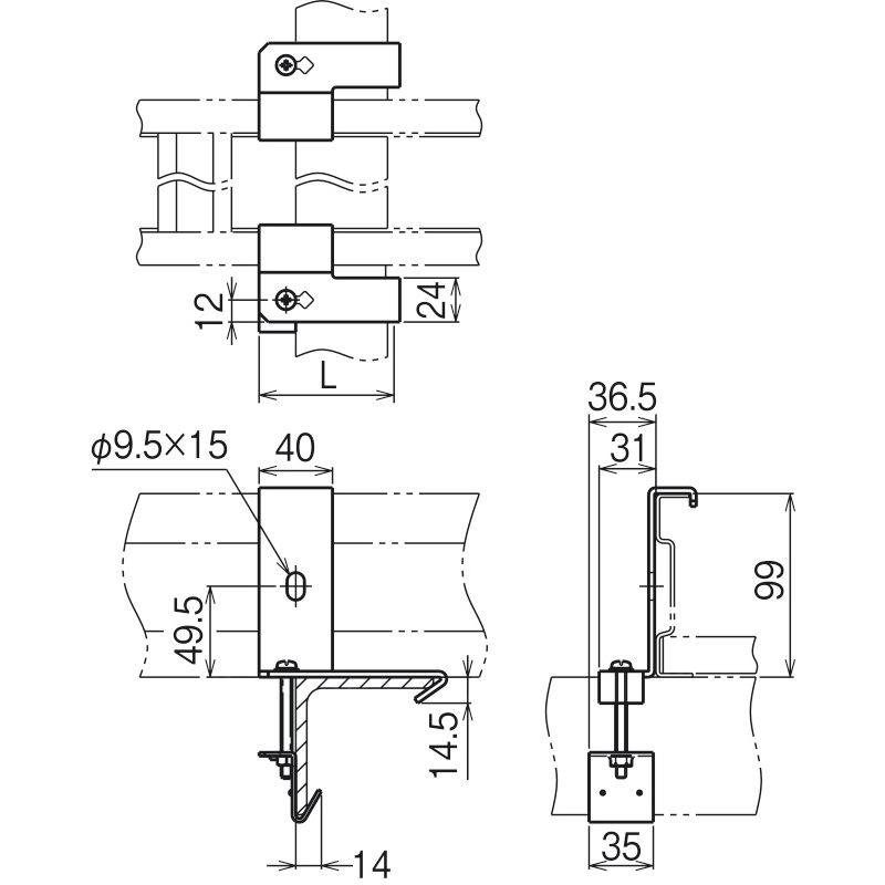 下部金具の固定はラック外方向の穴を使用してください。