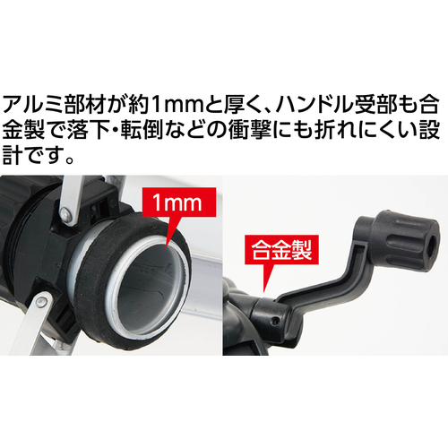 アルミ部材が約1mmと厚く、ハンドル受け部も合金製のため、落下や転倒に強いです。