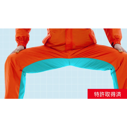 股下部分にマチを入れ、開脚姿勢を取った際の引きつれを軽減するフル開脚仕様です。(特許取得)