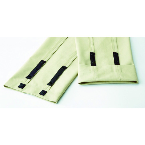 着用者の股下に合わせて裾上げができる4段階の調節ホックの付いたアジャスト機能付です。(意匠登録済)