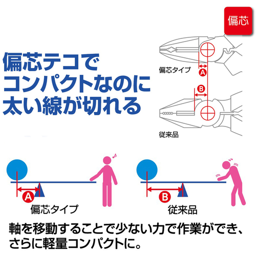 偏芯テコで、コンパクトなのに太い線が切れます。