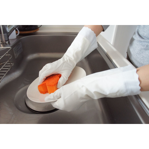 塩化ビニール製のため、天然ゴム製の手袋に比べて、洗剤や油に対して耐久性があります。