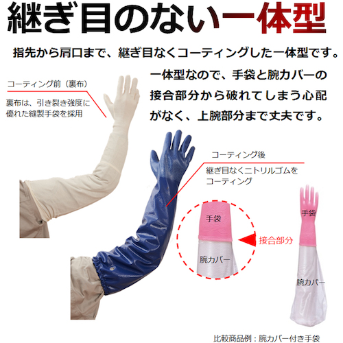 指先から肩口まで継ぎ目のない一体型ニトリル製ロング手袋です。