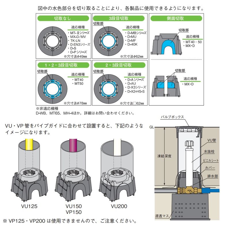 VU・VP 管に合わせたパイプガイド付です。