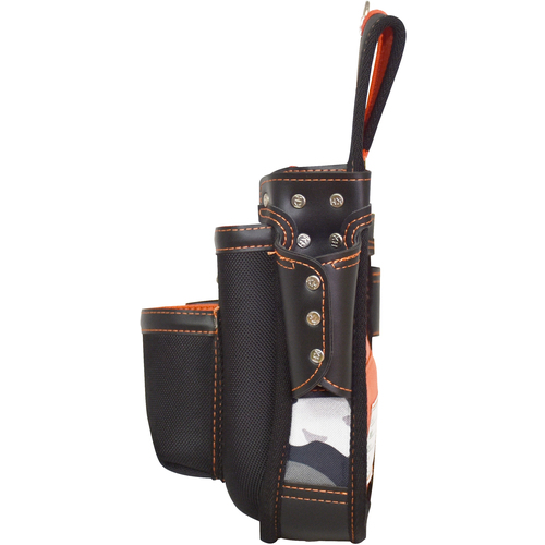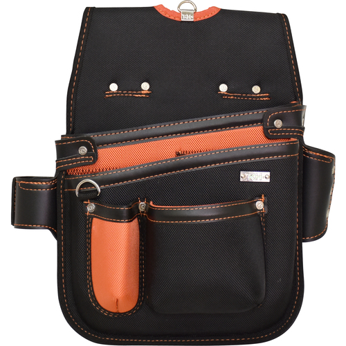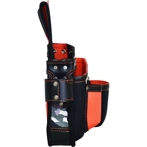 オレンジと迷彩が魅力的なファッション性です。●中身が取り出しやすくて落ちにくい斜めカットを採用しています。●摩耗と釘の突き抜けに強い、高密度1680デニール100%ナイロンを使用しています。●使いやすい標準サイズのポケット2段タイプです。●表裏で色違いのオシャレな生地です。●深いU字カットベルト通しでハーネスの上からも装着可能です。●釘が突き抜けないメッシュ式水抜き穴です。●工具を押さえるゴムバンド付きです。