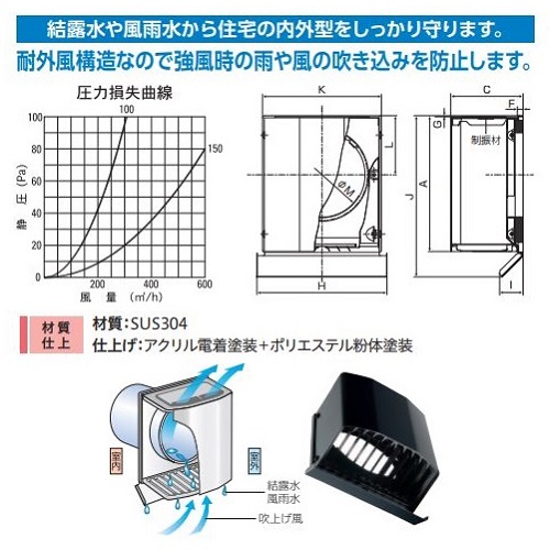 耐外風構造なので強風時の雨や風の吹込みを防止します。