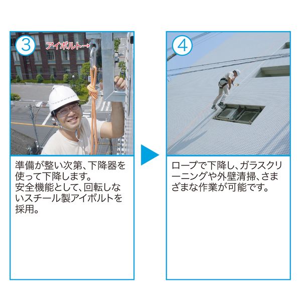 丸環のない屋上や開口部の場合でも、パラペット(胸壁)に挟み込んで取付け可能です。
