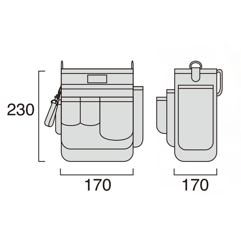 前面のテスター入れポケット、テープフッカーなど、電気工事向けに特化した腰袋です。