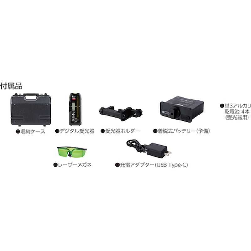 収納ケース、デジタル受光器、単3アルカリ乾電池 4本(受光器用)、受光器ホルダー、レーザーメガネ、充電アダプター(USB Type-C)、着脱式リチウムイオンバッテリー(予備)