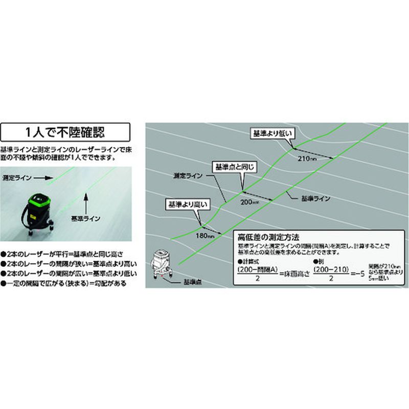 基準ラインと測定ラインを使用して床面の不陸(凹凸)や傾斜の確認が1人でできます。