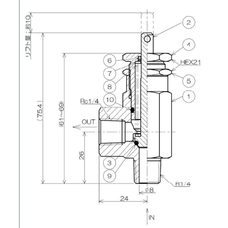 RM1T2V-R リリーフバルブ RM1シリーズ〈外部クラッキング圧力調整型〉【SCS14(SUS316相当)・FKM・(トグル)レバー】