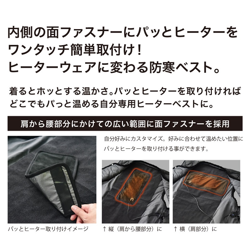 着るとホッとする温かさ。パッとヒーターを取り付ければどこでもパッと温める自分専用ヒーターベストに。
