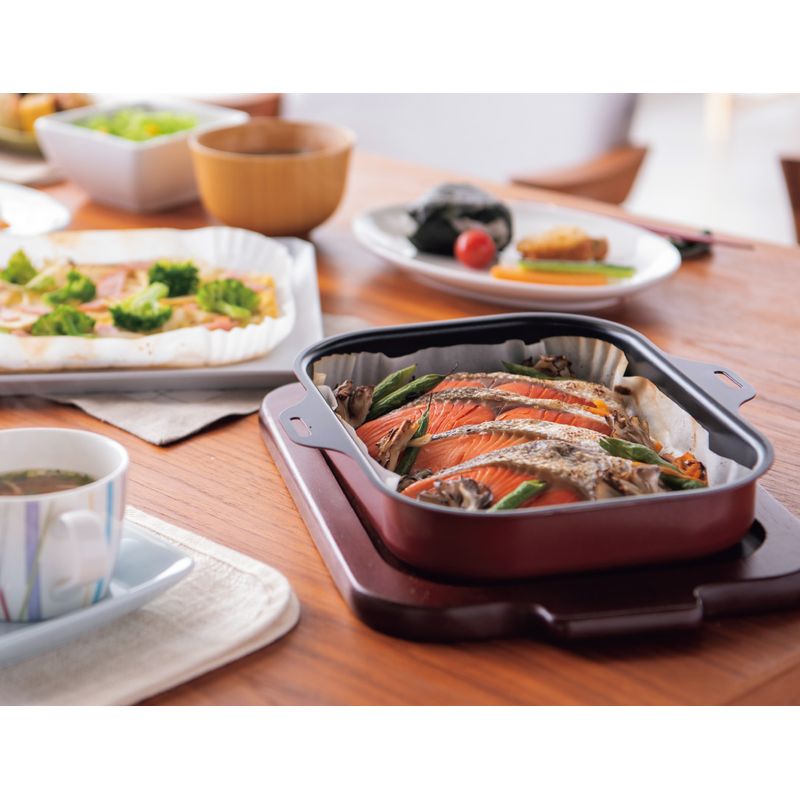 焼きあがったら、そのまま食卓に。使う食器が減ると、食事後の洗い物も減って時短になります。専用の木製プレートなら使いやすく、家族やゲストの歓声があがりそうな、おしゃれな食卓になります。