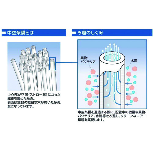 配管から流出する異物や水滴をシャットアウトし、クリーンなエアー環境を提供。メインフィルターシステムのサポート用としてもお使いください。