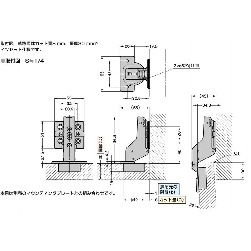 J95 重量用ワンタッチスライドヒンジ 93°開き インセット