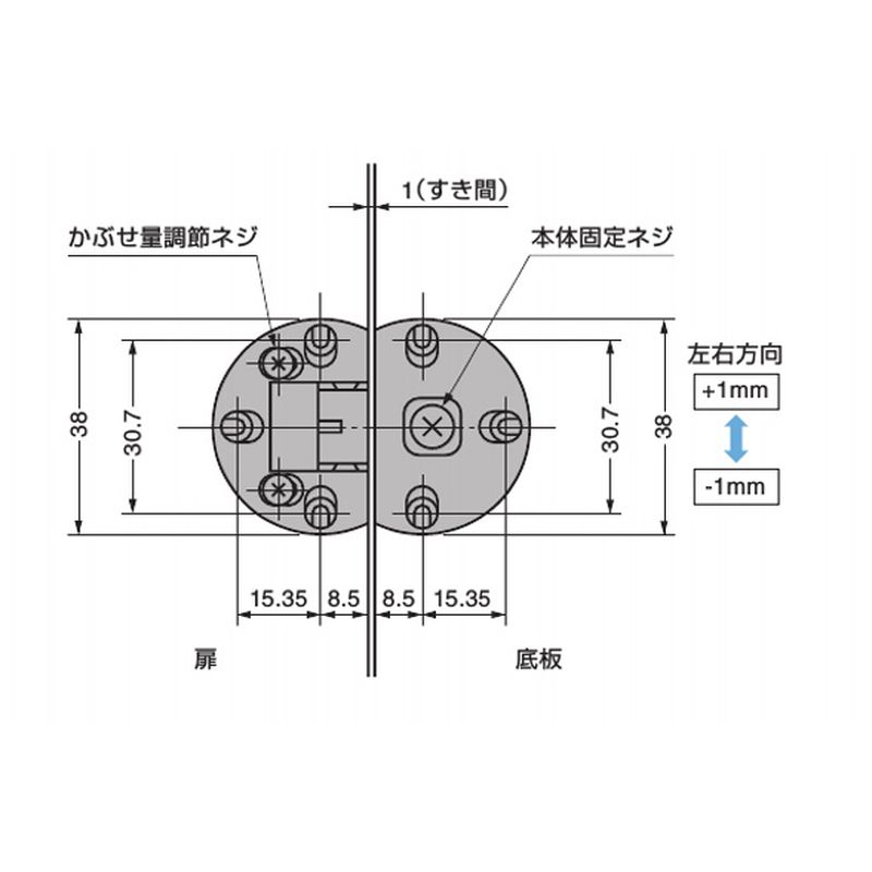 3方向の調節ができるドロップ丁番です。下開き扉用です。