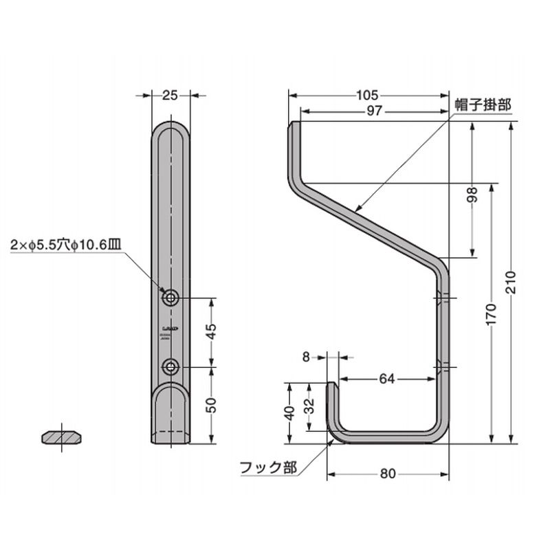 安全性とデザイン性に優れた、面取り形状の帽子掛です。