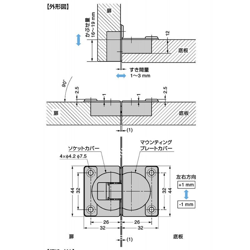 3方向の調整ができるドロップ蝶番です。