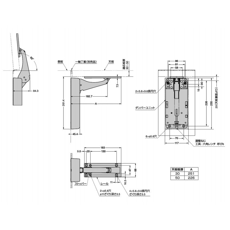 3セット以上では使用できません。開いた状態は、天板が固定されているわけではありません。吊元に大きな負荷がかかるため、丁番の強度・取付の強度が十分にあるものをご使用ください。(ステンレス鋼製長丁番LSN−C型など)スライド丁番(多軸丁番)との併用はできません。天板のみでは閉めた天板の保持はできません。閉めた天板の先端側に受け部を設置してください。