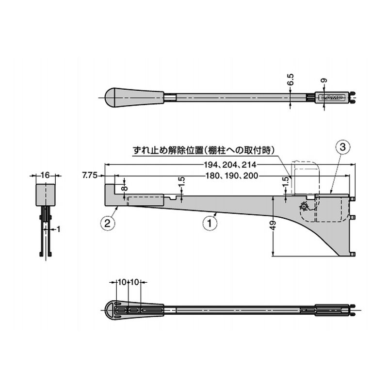 本品が不意に棚柱から外れるのを防止する抜け止め付です。