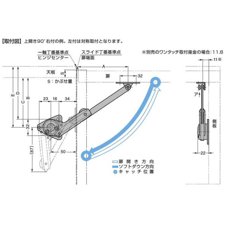 取付位置により、全開時の角度が80°、90°、100°になります。