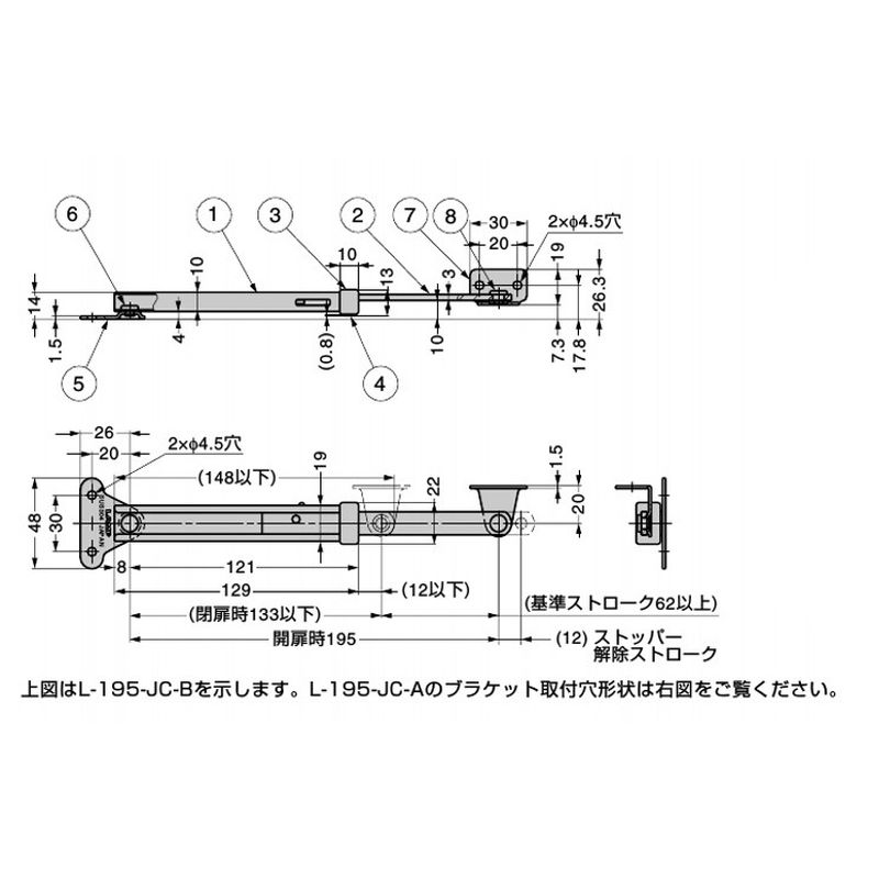 扉高さ、扉開き角度に応じて、上下ブラケットの位置を適宜に決められますが、この場合閉扉時のA寸法は伸縮最小寸法より大きくしてください。小さい場合は丁番やフラップステーを破損するおそれがあります。扉1枚につき1本使いでご使用ください。2本使いで使用すると、左右の作動が同調しない場合があります。本製品を扉以外のストッパーとして使わないでください。取付場所や用途によってストロークに余裕をもたせてください。