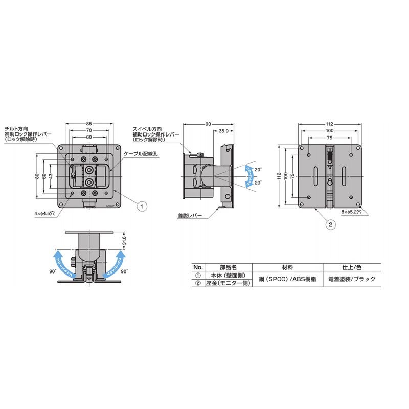 レバー操作により、任意の位置で補助ロックがかかるので、微振動によるモニターの垂れ下がりを防止します。タッチパネルモニターにも最適です。
