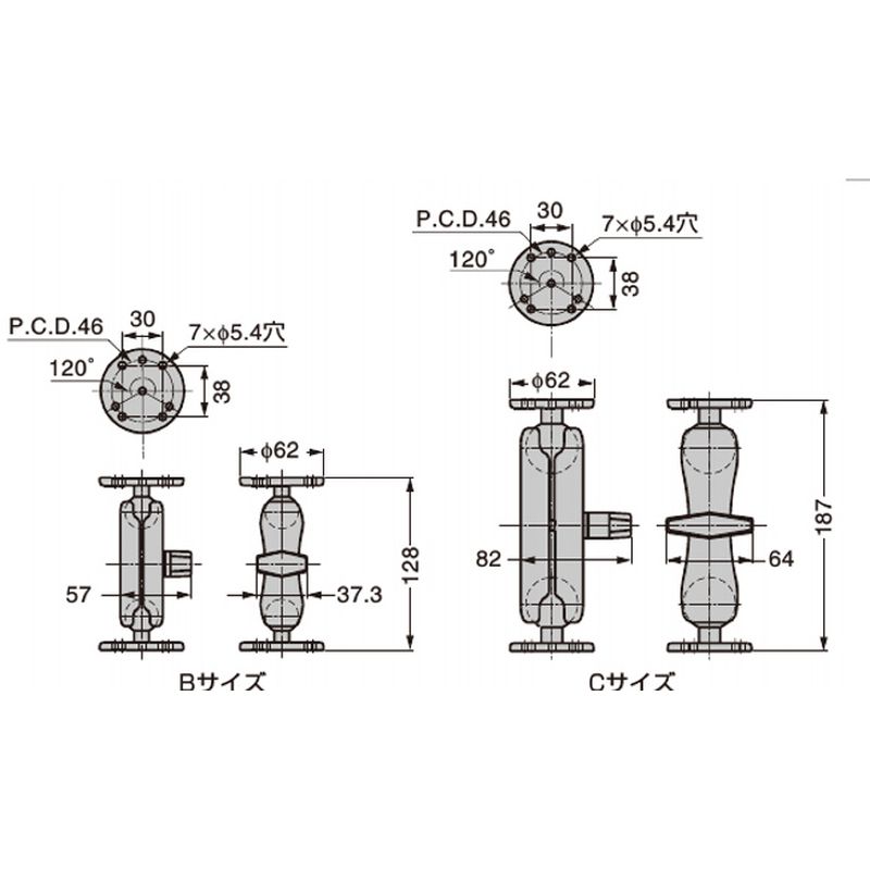 ボールはφ25.4 mm(Bサイズ)、φ38 mm(Cサイズ)の2種類があり、それぞれのサイズに合ったRAM本体があります。