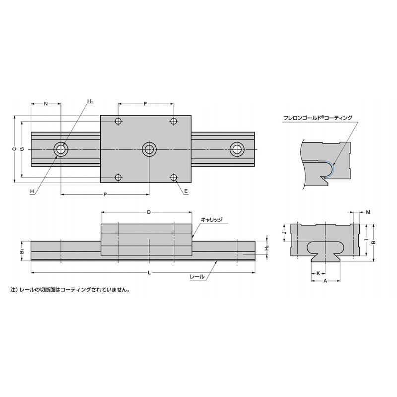 キャリッジの内側部はフレロンコーティング処理で、使用時に微細なフレロン粒子がレール表面に転移し、フレロン粒子によるフレロン本体との自己潤滑状態が得られ、グリスやオイルの塗布が不要です。