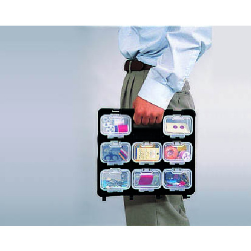 スケルトン小箱は、パーツを入れたままスケルトンパーツボックスや棚に整理保管でき、使用時はベルトなどに吊ることができます。