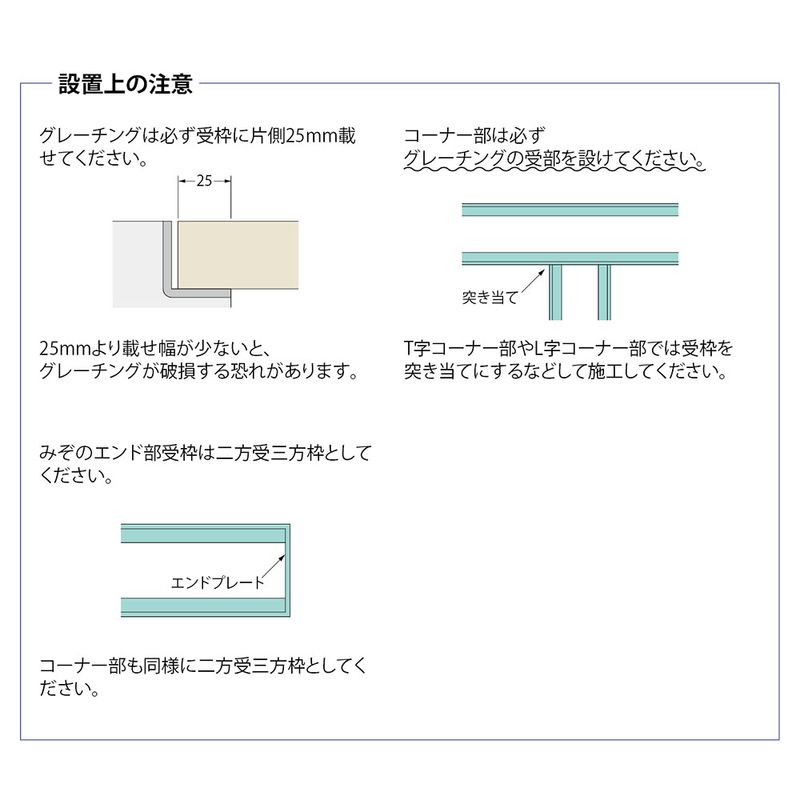 みぞのコーナー部、T字部などは受枠を突き当てにするなど、必ずグレーチング両端を受けるようにしてください。