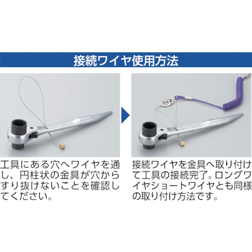 接続ワイヤ2本付きで、お好みに応じてロングワイヤ、ショートワイヤ、リングへの工具取り付けが可能です。