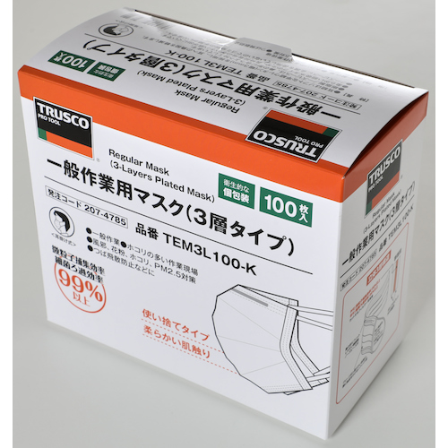 TRUSCO TEM3L100-K 一般作業用マスク(耳掛けタイプ)3層(100枚入個包装)