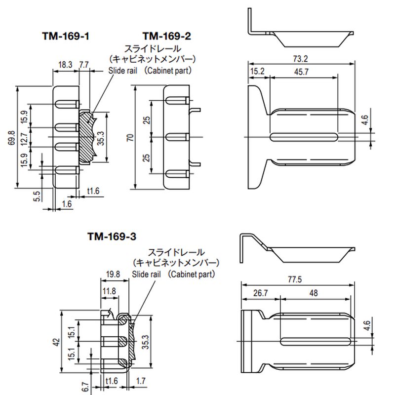 TM−167、168をシャーシに固定する際の専用ブラケットです。レールの形態、定格荷重に応じて、3種類ございます。