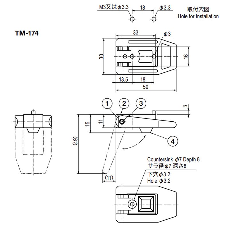 機器の操作面を見やすくするための支持足です。使用しないときは、アームを後方へ回転収納できる構造で、アームは前後ともにストップ機構があります。また、TM−175単品にてゴム足としてもご利用ください。