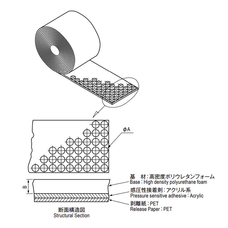 摩擦係数が高く、優れた滑り止め効果があります。耐久性の有る弾性体で、亀裂を生じたり硬化したりしません。耐摩耗性に優れています。緩衝作用・制振作用があります。裏紙をはがすだけで、簡単に固定することができます。