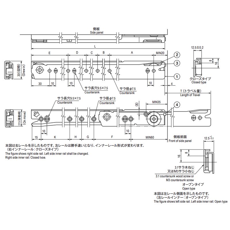 アウターレール・インナーレール双方にスロープを設けたため、引出しは閉まる少し手前でも自然に、確実に、自動的に引き込まれます。ローラー外周にはウレタンゴムを使用しておりますので、静かでスムースな動きが得られます。右レールのインナーレールをクローズタイプとしているため、引出しの左右のガタが少なくなります。各メンバーは抜差可能です。