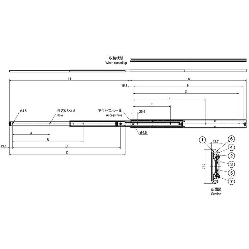 ダブルスライド、オーバートラベル製品です。開閉時消音機構及び、収納時キャッチ機構を備えております。
