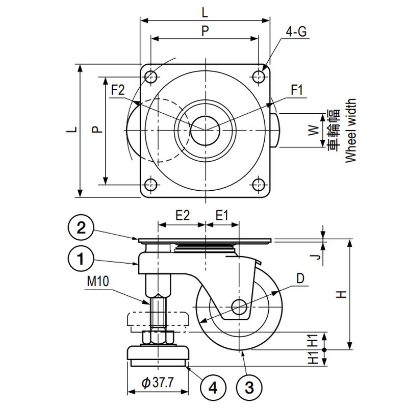 アジャスターフット付きのキャスターです。