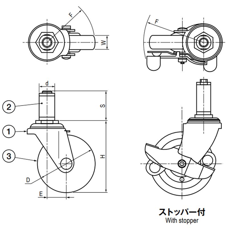パイプにさしこんで座金をまわすだけで簡単に取り付けできるキャスターです。