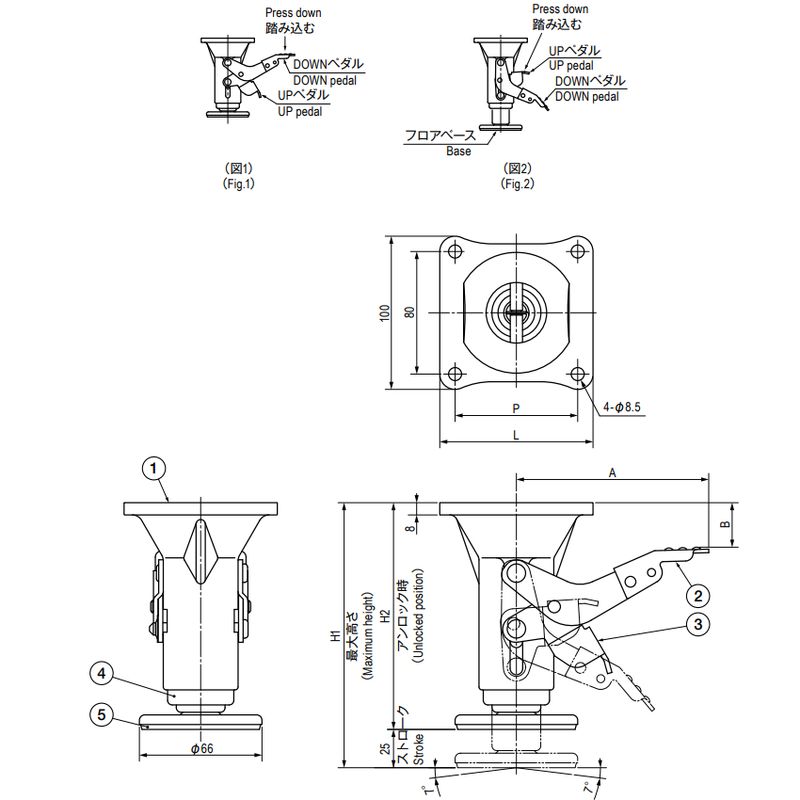 台車を持ち上げるのではなく、内蔵スプリングの働きにより、床面を押し付けてロックします。