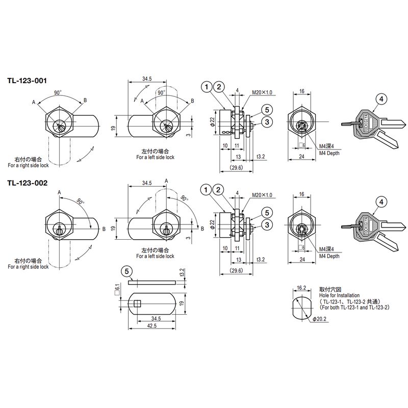 キー回転は、A・B間90°回転です。キーの抜差しは、TL-123-1は、A点B点ともに可能です(2点抜き)。TL-123-2は、A点でのみ可能です(1点抜き)。止め金具は組替え可能な左右兼用型です。「錠前の注意事項」もご確認ください。