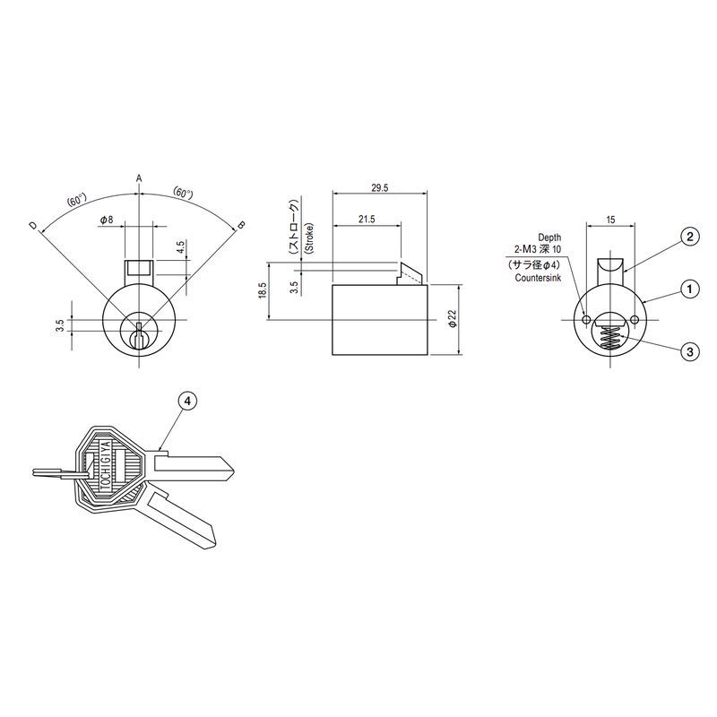 施錠はキーなしで行えます。解錠は、AB間もしくはAD間のいずれでも可能です。キーの抜き差しはA点のみです(1点抜き)。「錠前の注意事項」もご確認ください。