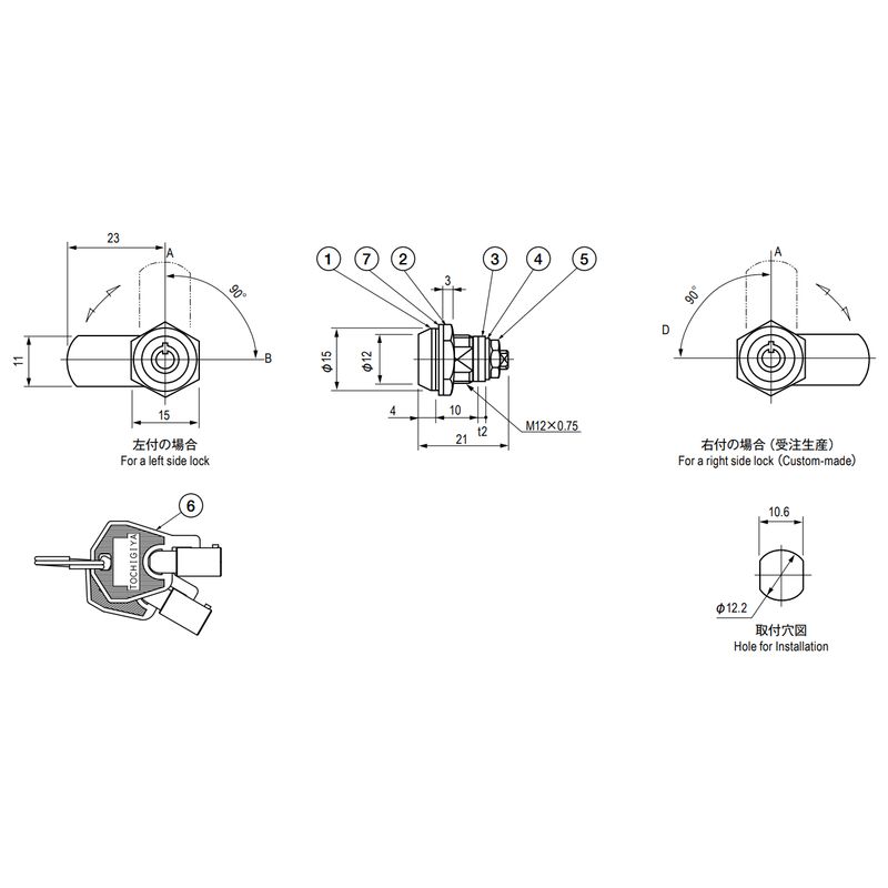 キーの回転は、A・B間90°回転です。キーの抜差しは、A点のみ可能です(2点抜きは受注生産)。止め金具は組み替えできません。「錠前の注意事項」もご確認ください。