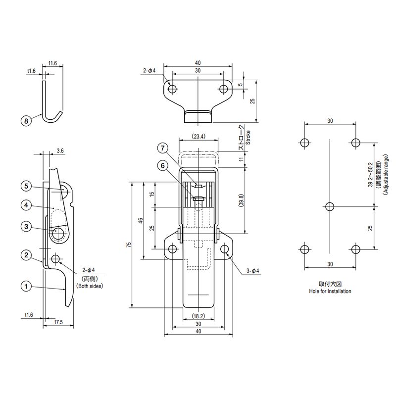 締付代を調整できるアームキャッチです。ストッパーシャフトをレバー側からドライバー等で回転させると、アームが移動できます。パッキン使用の場合に適します。
