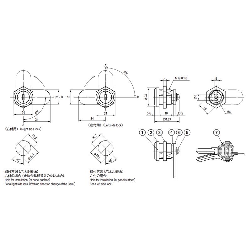 キーの回転はA・B間90°回転です。キーの抜差しは、A点、B点共に可能です(2点抜き)。「錠前の注意事項」もご確認ください。