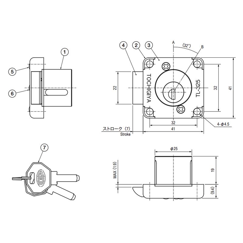 キーの回転は、A・B間約32°回転です。キーの抜差しは、A点のみ可能です(1点抜き)。「錠前の注意事項」もご確認ください。解錠はAB間のキー操作で可能です。