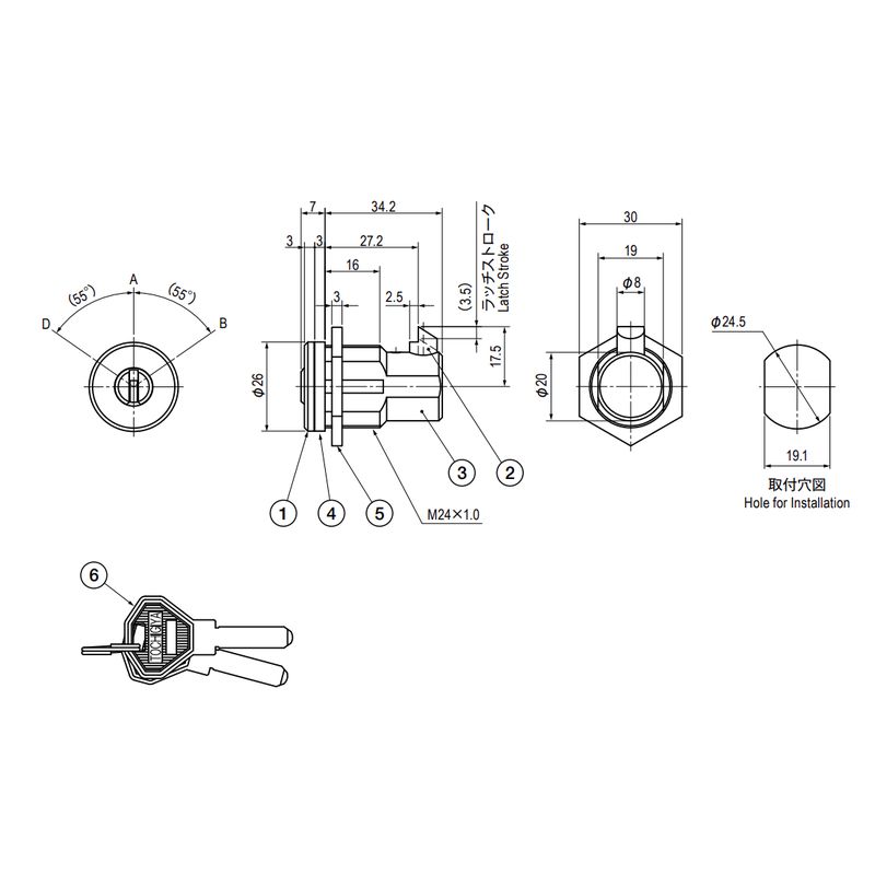 解錠は、AB間またはAD間で可能です。キーの抜差しは、A点でのみ可能です(1点抜き)。「錠前の注意事項」もご確認ください。